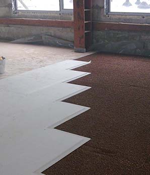 Толщина засыпки выбирается в зависимости от неровностей пола - составляет 3-4 см, но не более 6 см. Иначе потом могут появляться вмятины на верхнем покрытии от тяжелых предметов. Если применяются гипсоволокнистые листы (ГВЛ), то их лучше укладывать в 2 слоя, проклеивать стыки, закреплять их саморезами. Некоторые производители сейчас выпускают уже ГВЛ, состоящие из 2 листов плиты с фальцевыми соединениями, которые очень удобны для укладки. Фанеру или ДСП можно укладывать в 1 слой, если их толщина не менее 12 мм. Зазоры между их соединениями заполняются шпаклевкой, а сами плиты обрабатываются горячей олифой или битумной мастикой.